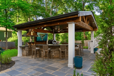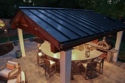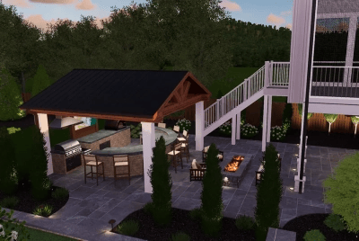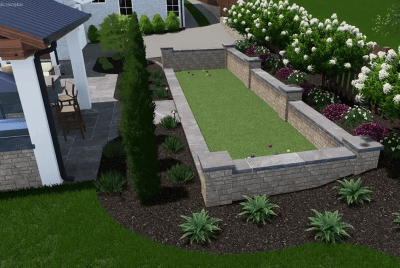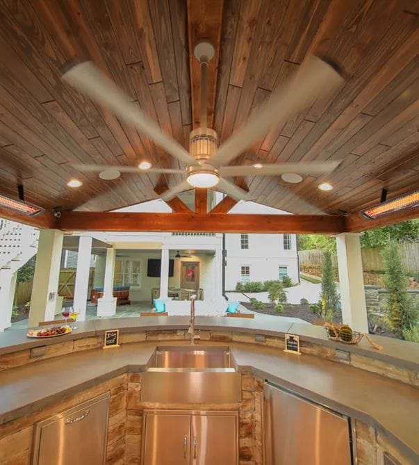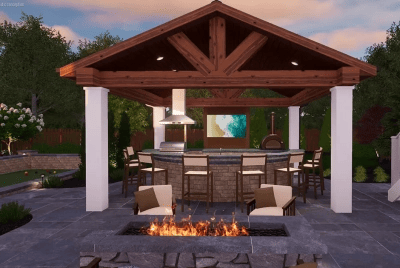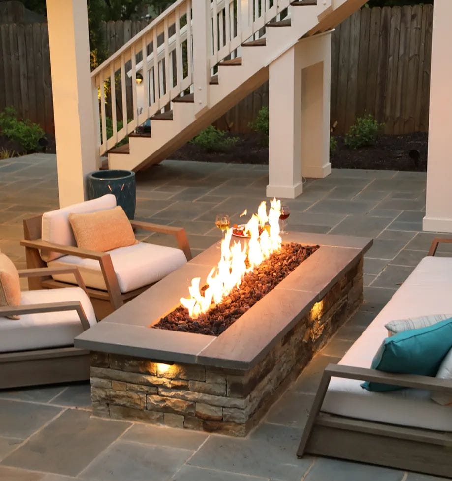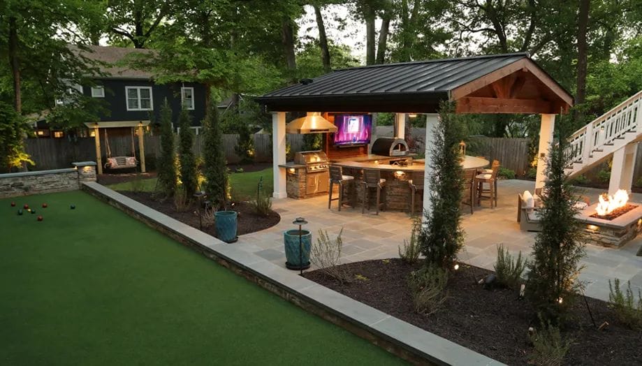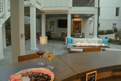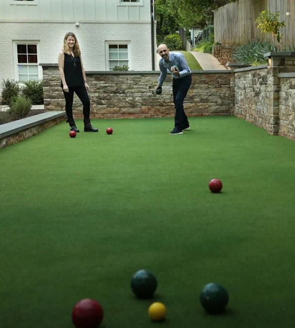 This project in Decatur, Georgia, was designed as a family retreat that became a haven during the COVID quarantine. The outdoor space incorporates Italian-inspired elements, reflecting the client’s heritage, with features such as a wood-burning pizza oven, Italian cypresses, and herb gardens filled with rosemary and other plants to evoke the feel of Italy. A bocce ball court with synthetic turf adds a playful touch, and a spacious portico was built for cooking and entertaining, complete with a bar, grill, and pizza oven. For year-round enjoyment, a linear gas-burning fire pit and 6,000-watt heaters were installed, making the space functional even in colder months. The result is an outdoor area perfect for family gatherings, cooking, and relaxation, blending comfort with a Mediterranean flair.