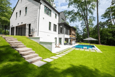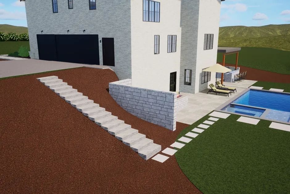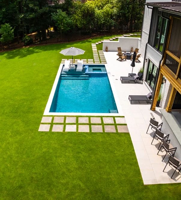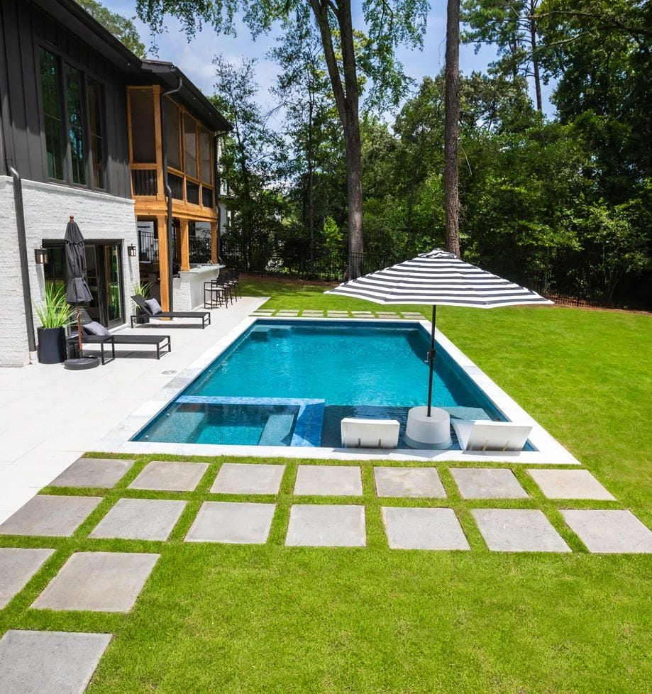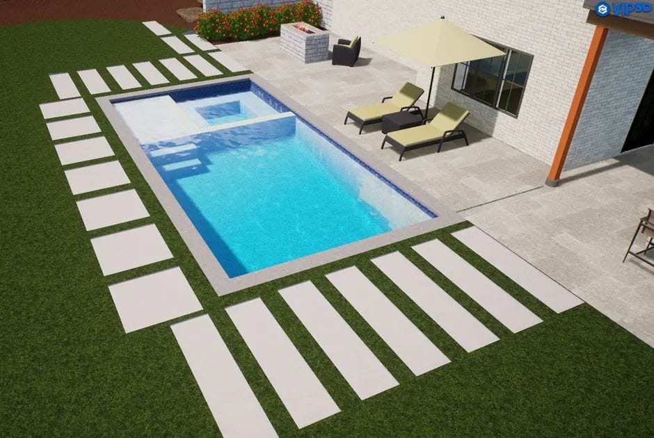 Adjacent to the kitchen, we installed a stylish pathway alongside the pool, ensuring easy access while enhancing the modern aesthetic of the space. The pathway complements the clean lines of the porcelain pool deck, guiding guests smoothly.
