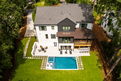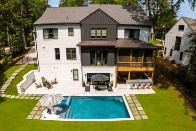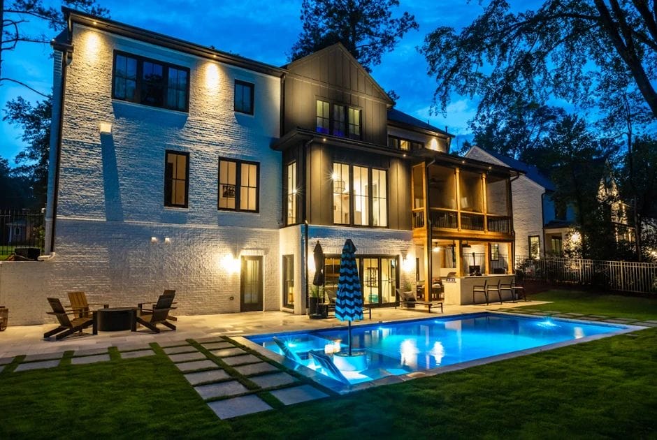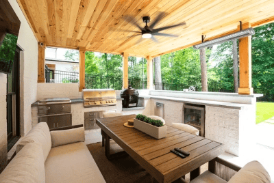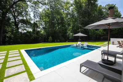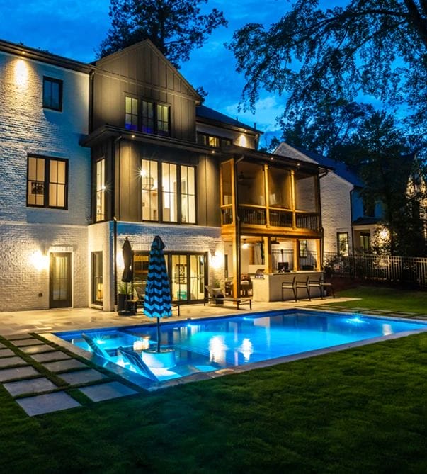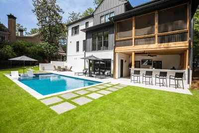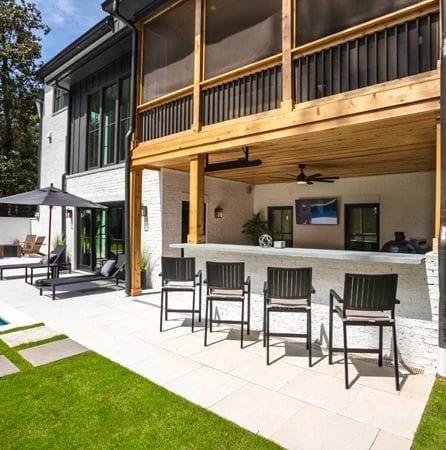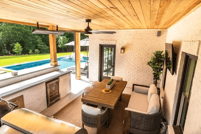 The client had their porch wrapped in cedar for a modern look, installed double doors for basement-pool access, and used ivory porcelain for the pool deck and patio. They also added an outdoor kitchen with a bar and TV, creating a functional, stylish space for entertaining and family enjoyment. As our client enjoys cigars outside, and the family love entertaining, so we designed the entire space to suit their lifestyle.