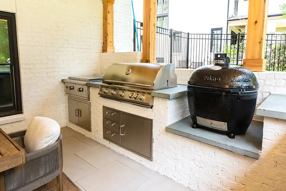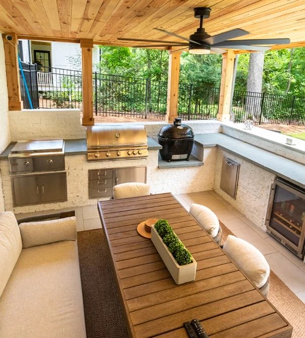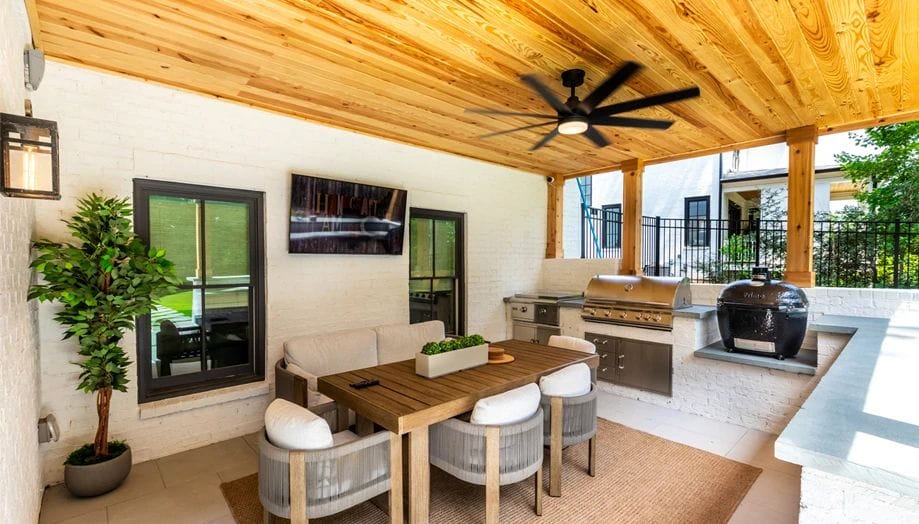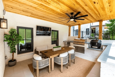 The outdoor kitchen for this project was designed to be the perfect hub for relaxation and entertainment. Equipped with a bar and a TV, the kitchen allows for a seamless blend of cooking, dining, and leisure.