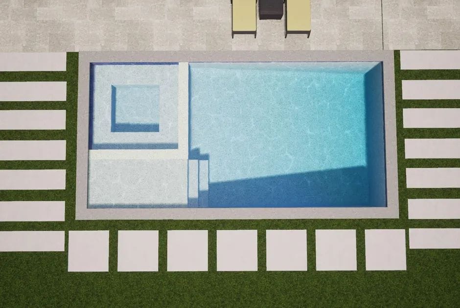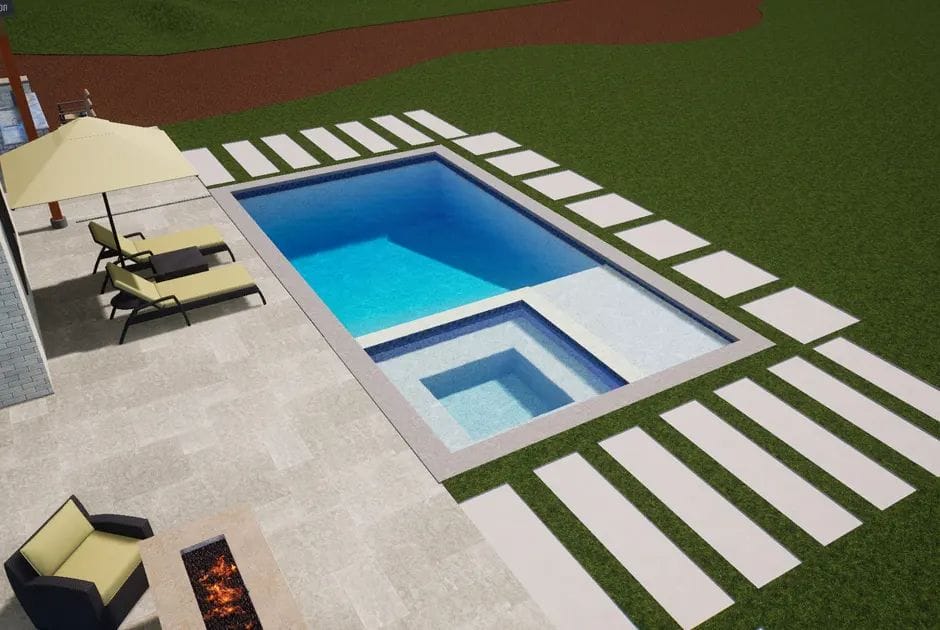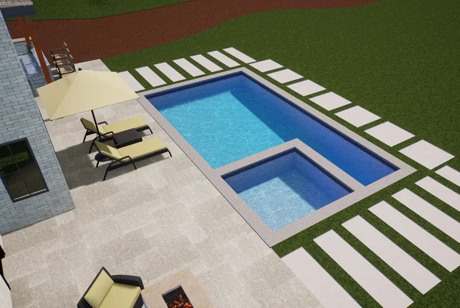 The pool itself features a lounge area and a hot tub, both seamlessly integrated into the design, with everything flush and smooth, creating a stunning look where all elements feel submerged just below the water level. It’s a sleek, minimalist aesthetic that keeps the entire space feeling super clean and sophisticated.