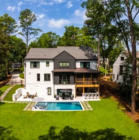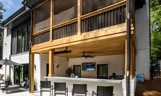 We transformed their porch by wrapping it with cedar, giving it a more modern look that matches the updated areas of the house. We also installed double doors to connect the basement directly with the pool area, enhancing the flow of the outdoor space.