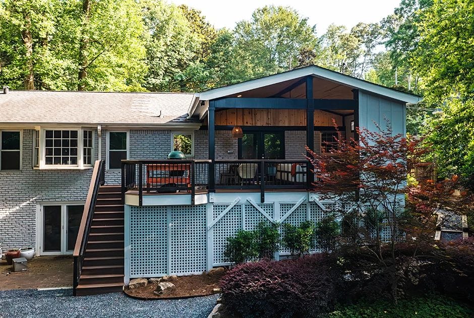 The deck showcases TimberTech Pecan composite, complemented by a matching drink rail that caps the railing. Beneath, lattice deck skirting encloses the space, creating a polished look for the area, even though there's no outdoor living space below.