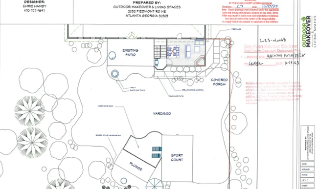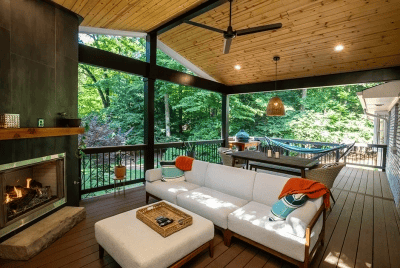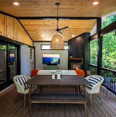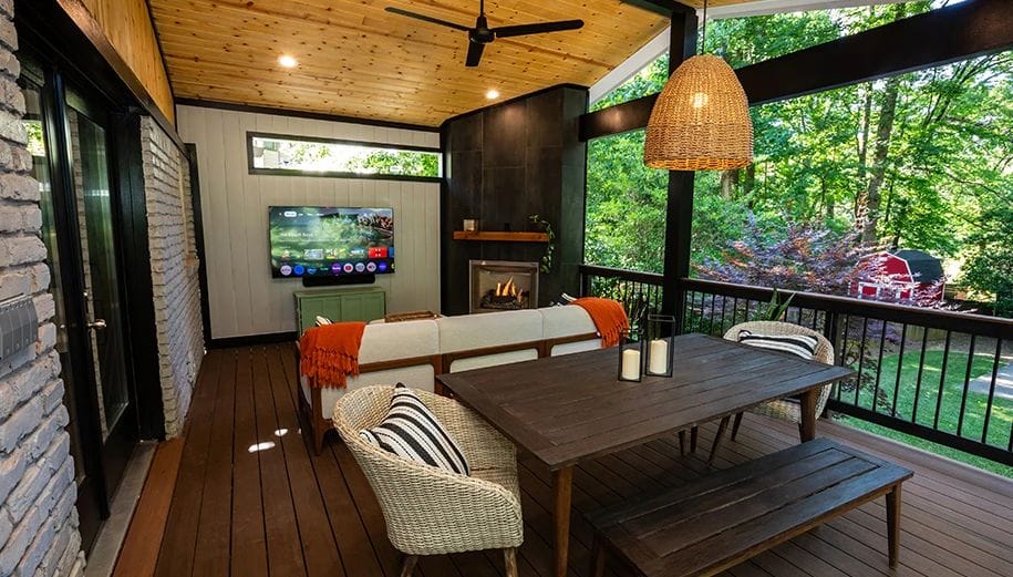 A custom privacy wall with an opening at the top allows for airflow while supporting a TV at a lower level, providing a comfortable viewing experience without blocking the breeze.